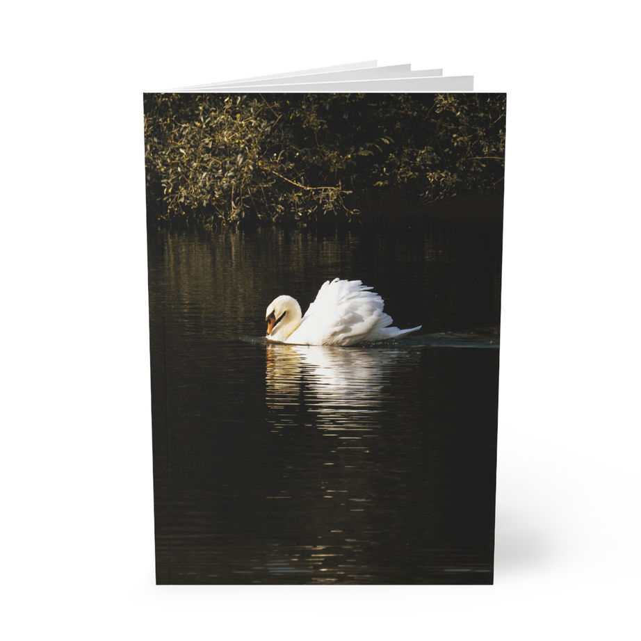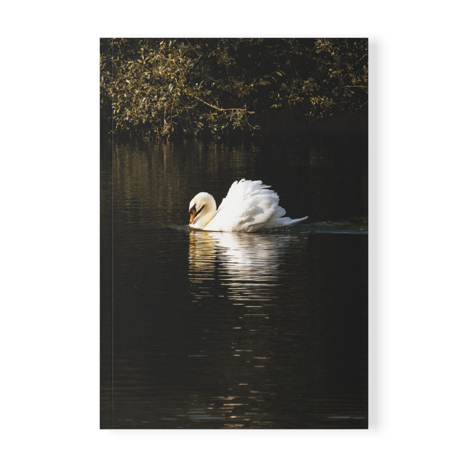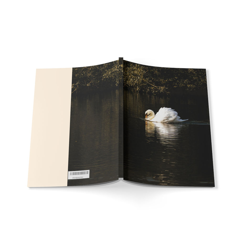 Featuring a serene photograph of a swan gliding across still water, the cover evokes grace, reflection, and quiet strength. The imagery flows beautifully across the front and partially around the back, creating a refined, artful finish that feels both modern and timeless.